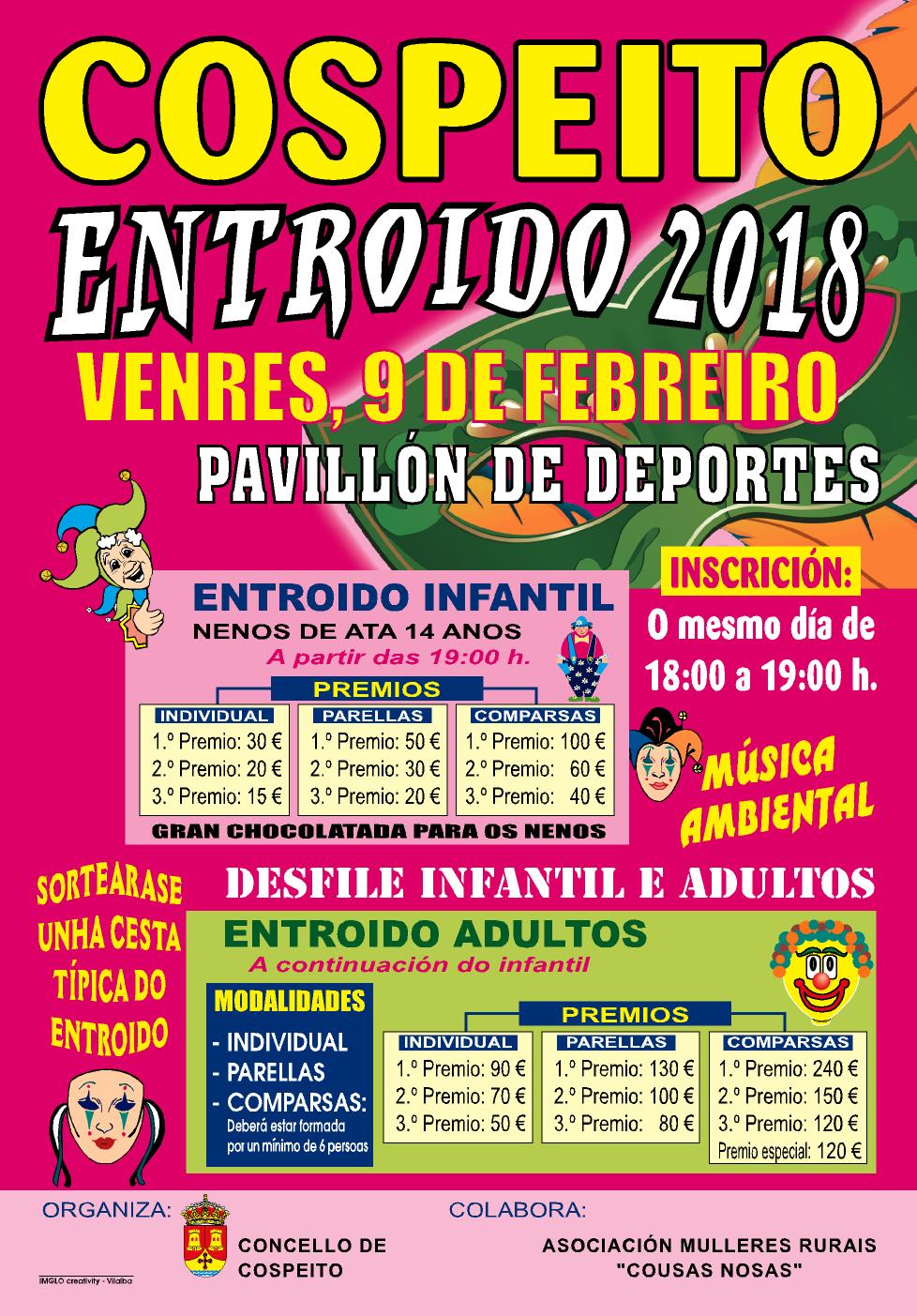 Entroido en Cospeito 2018 Ene 31, 2018 | ACTUALIDAD, Avisos, CONCELLO, Eventos, Noticias, SERVIZOS, TURISMO O Concello de Cospeito celebrará o Entroido infantil de 2018 o Venres 9 de Febreiro no Pavillón dos deportes, a inscrición realizarase o mesmo día de 18 a 19 horas, o certame estará organizado polo Concello de Cospeito e colabora a Asociación de Mulleres rurais, Cousas Nosas.