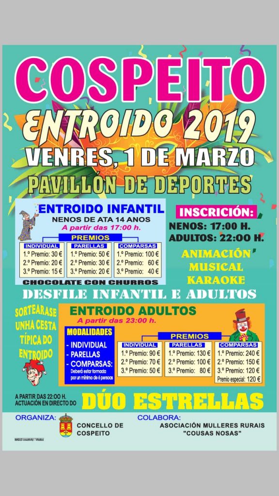 Entroido 2019 en Cospeito | Venres 1 de Marzo Feb 22, 2019 | ACTUALIDAD, Avisos, Noticias, SERVIZOS BASES CONCURSO ENTROIDO 2019Descarga
